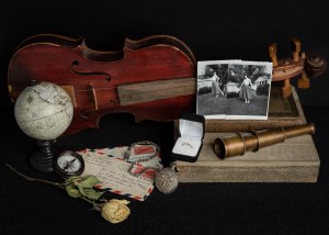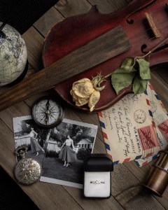 I decided to ask my kids to help gather some props and they eagerly jumped to the task. My son came out of his room with a battered violin he found at his grandparents’ house. The thing looked incredible! My daughter emerged from her room with a pocket watch and what looked like an engagement ring. And we found some old black and white photos of my kids’ grandma when she was young.